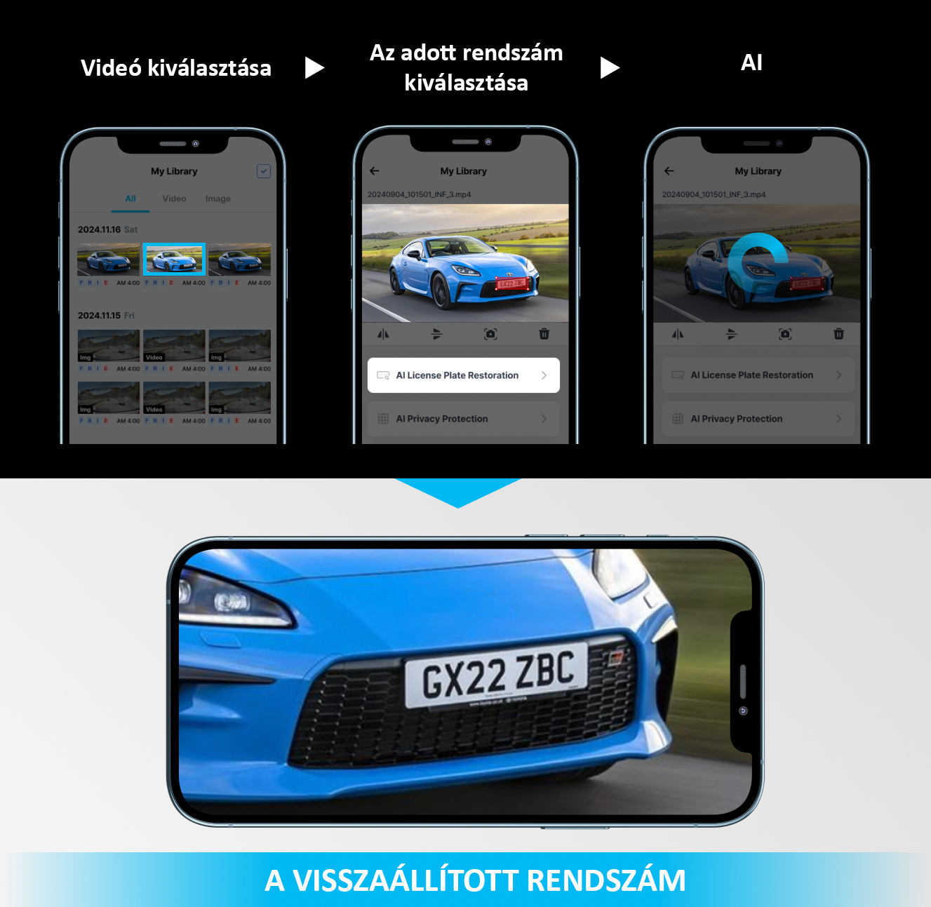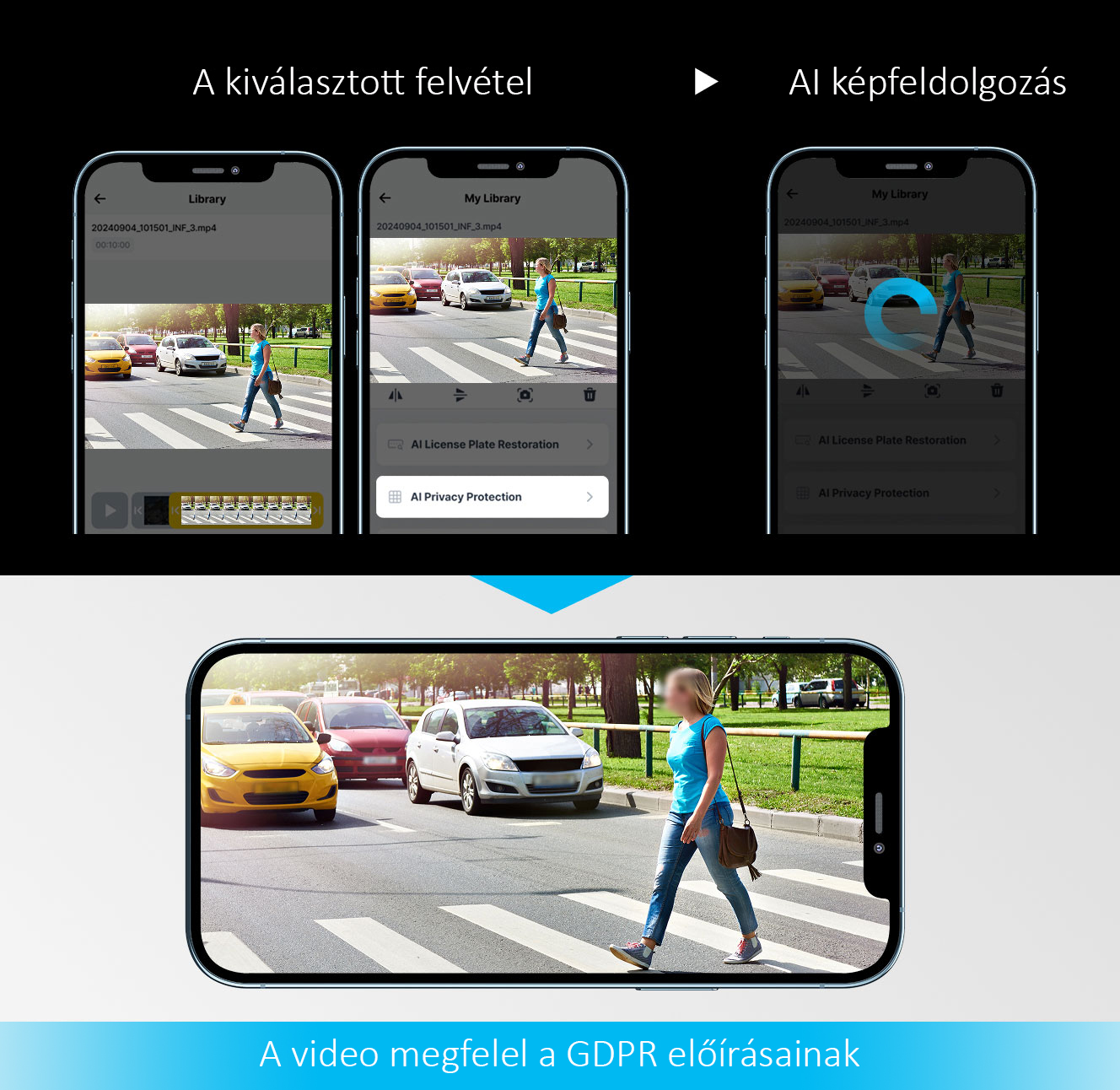 A Vueroid alkalmazás az AI-t hívja segítségül, hogy Ön egy mozdulattal a személyiségi jogoknak megfelelően módosíthassa a felvételt. A program felismeri a rendszámtáblákat, a felvételen szereplő arcokat és elhomályosítással alkalmassá teszi arra, hogy Ön feltölthesse, megoszthassa és ne sértse meg a személyiségi jogokat.