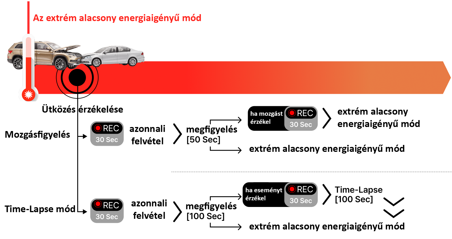 Parkolási módban a kamerarendszer úgynevezett „alvó” állapotba kerül, amikor az energiaigénye elenyésző értékre csökken, így nem terheli a jármű akkumulátorát és nagymértékben megnöveli a parkolómód idejét. Ütközést érzékelve azonnal indítja a felvételt, majd 30 másodperc után leáll és 50 másodpercig figyelőállásban marad, majd ha nincs kiváltó ok, akkor visszatér alvó állapotba.